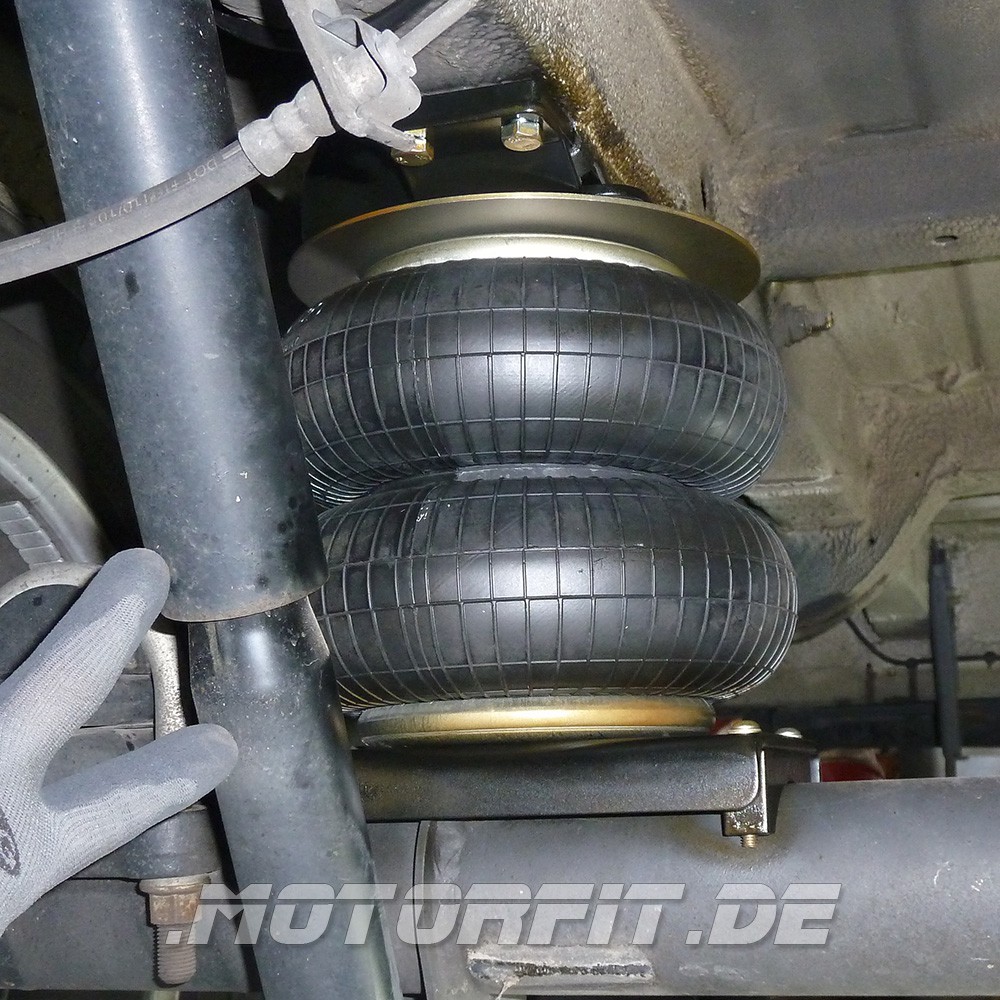 Basis-Kit: Zusatz-Luftfederung mit allen fahrzeugspezifischen Anbauteilen. Marken Luftfederbälge von CONTI/GOOD YEAR!, Schläuche und Füllventile. Die Luftbälge sind über die mitgelieferten Ventile einzeln mit externem Kompressor oder auf der Tankstelle einstellbar.