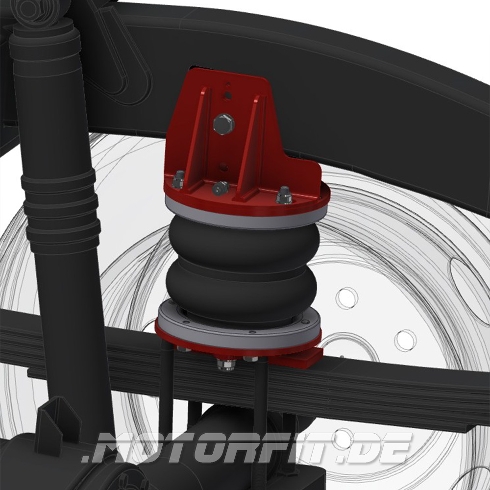 Zusatz-Luftfederung Basis-Kit (Semi-Air) mit allen fahrzeugspezifischen Anbauteilen, ohne TÜV Gutachten. Einzelabnahme erforderlich. Je nach Ausführung ist eine Auflastung bis 3,5 to zulässiges Gesamtgewicht möglich! Luftfahrwerk