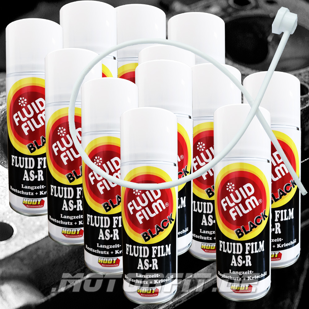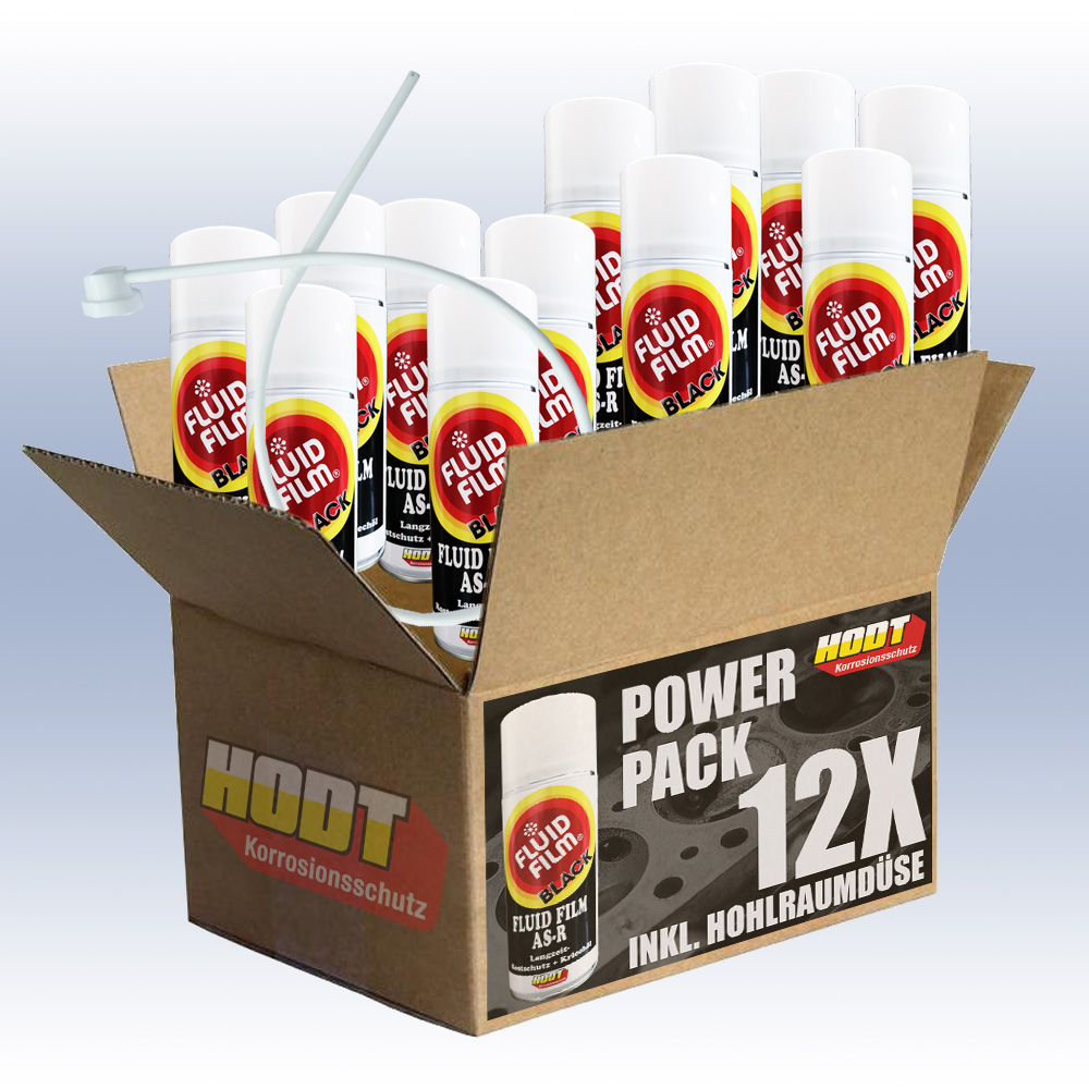 HODT Fluid Film AS-R BLACK - 12x 400ml Spraydose Hochwirksamer Rostschutz für Marine, Wohnmobile, Youngtimer, klassische Fahrzeuge (classic Cars) inkl. Hohlraum-Sonde (60cm lang) mit Rundumdüse