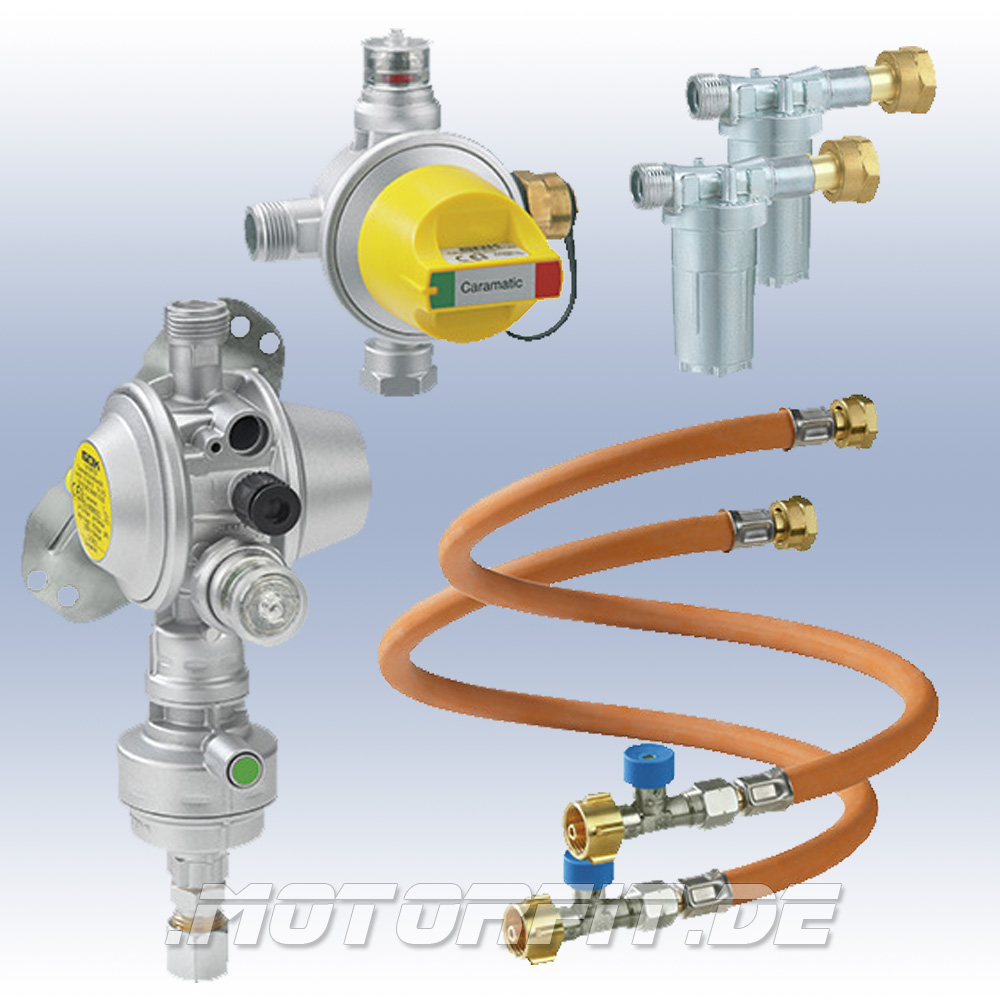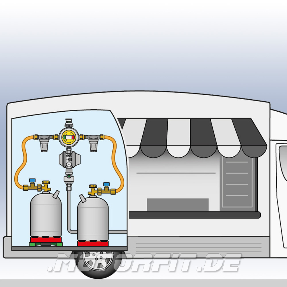- enthält alle Bestandteile zur Inbetriebnahme einer Zweiflaschenanlage, die zur Gasversorgung während der Fahrt geeignet sind